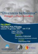 Oggi alle 17:30 al Teatro Politema si commemorerà Paolo Borsellino in una iniziativa organizzata da Alleanza Nazionale e dalla Fondazione Giuseppe e Marzio Tricoli: Diventerà bellissima. Interverranno Fabio Granata, Fabio Tricoli, Francesco Forgione (presidente della commissione parlamentare antimafia) e concluderà Gianfranco Fini.