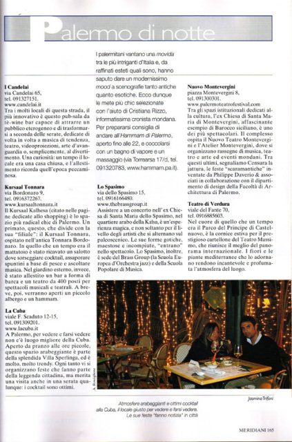 È uscito il numero di marzo di Meridiani, il mensile di viaggi edito dalla Editoriale Domus (la casa editrice di Quattroruote). Si parla di Palermo e della Sicilia Occidentale. Le pagine sono piene di meravigliose foto a tutta pagina, che rendono giustizia alla nostra città. Senza nulla togliere alla estrema bravura di chi le ha scattate, sono orgogliosa di poter dire che siamo belli dentro. Mi spiego: per ottenere foto ammalianti di Palermo, basta semplicemente farle, senza troppi artifici, chessò, sulla luce migliore o sull’angolazione… Il paragone non è originale ma, se una ragazza è bella, basterà scattare delle foto in modo naturale e senza artifici; se è “un tipo” bisognerà renderla intrigante con il trucco, con giochi di luci e ombre, trovare la bellezza dove non c’è e trasformarla in “personalità”. Palermo no. È bella in senso classico. La mattina e senza trucco. Acqua e sapone (anzi, “pane e acqua”, come diceva quello…). Alcuni angoli esprimono una decadenza poetica e malinconica, anche questo emerge dall’editoriale, che oltre a elogiare le nostre bellezze architettoniche e a esaltare l’ondata di nuovi autori, dice: “Ci si bea della malia tormentosa che Palermo sa trasmettere, del suo incanto nobile e straccione. Eppure, al contempo, è come se si percepissero un decadimento e un degrado nuovi, quasi pop, che si sovrappongono e sostituiscono a quelli pregressi: meno spudorati forse, ma rispetto a quelli più grevi e banali: il caos prodotto dai nuovi residenti che stanno ripopolando disordinatamente il cuore della città, la loro incuria per questi luoghi; ma forse perfino i loro sembianti anonimi, il loro abbigliamento, restituiscono inconsapevolmente un senso di rassegnazione e di inesorabile perdita di identità”. Matteo Di Gesù taglia carne e ossa, come si suol dire, ma come dargli torto? (Tranne nel pezzo sui tratti somatici anonimi e sull’abbigliamento…ma chi bbiene a dire?). Il pezzo principale sul capoluogo è “Palermo anno zero: restauri, giovani talenti, ma il cuore della capitale siciliana resta irraggiungibile”. Eppure Jasmina Trifoni, senza accorgersene lo ha raggiunto e lo ha raccontato. Dalla sua mini bio leggo che si è occupata di Medio Oriente, ha viaggiato tanto, in zone non facili della Terra e ha ritratto quei luoghi in un libro fotografico, Afghanistan. Le donne, la guerra, l’Islam, realizzato per Emergency (è autrice anche, insieme a Marco Cattaneo, di un’opera in tre volumi sul Patrimonio Mondiale dell’Unesco). Che sia una cittadina del mondo lo si intuisce da come racconta la nostra città: ironizzando sulle sue peculiarità, – che troppe volte da altri giornalisti sono state disprezzate, o peggio, esaltate in modo mellifluo, al limite della compassione – con una mentalità aperta, senza pregiudizi, con obiettività. Ha colto la sensazione di eterna rinascita, questa reincarnazione in metropoli che non è mai avvenuta, il senso di sospensione delle cose lasciate a metà, e per questo, sempre perfettibili. Sono semplicemente dei tratti distintivi, e così vanno presi. La giornalista cita Roberto Alajmo e la sua metafora della cipolla, i manifesti su Palermo cool, racconta il suo incontro con Davide Enia e le case distrutte dai bombardamenti a Piazza Magione e continua con gli altri talenti locali: Ciprì e Maresco, Gianni Gebbia, Ficarra e Picone; intervista Piergiorgio Di Cara, cita Uwe Jäntsch e il suo “museo” sgomberato dall’amministrazione comunale (“Uwe sta progettando altro, a Palermo le fonti d’ispirazione non mancano”). Scrive di luoghi magici: “La città è un work in progress, dove degrado e scintille di genialità sono l’uno accanto alle altre. Forse è per questo che qui, anche se si restaurano i ruderi, lo si fa in modo creativo. E si ha il coraggio di non andare fino in fondo: qualcosa di concluso – o di “rinato”, se vi piace di più – striderebbe con l’insieme, ancora ferito dalla guerra, gli edifici riacquistano fascino e dignità nel loro restare ruderi. (…) Lo Spasimo, dove l’assenza del tetto diventa presenza, tangibile, delle stelle, luminosissime nelle dolci notti palermitane. E le macerie di Palazzo Bonagia sono diventate la più stupefacente delle scenografie mai inventate. Più che di pietre e di calce, questo spazio sembra fatto della materia dei sogni. (…) Palermo è una filosofia di vita – continua la giornalista -, un laboratorio della contemporaneità”. Nella chiosa poi, riporta una frase di Daniele Billitteri anzi, “Billi”: “Il tempo è come un orologio (…) solo che a noi, qui ‘mPalermo, non interessa sapere dov’è la lancetta”. Di seguito c’è un pezzo intitolato “Cosa è rimasto dei giardini islamici della Conca d’oro?” e le interviste a Giampiero Caldarella (inventore di Pizzino), Mimmo Cuticchio e al nostro amato Billitteri. La rivista descrive anche le mete più suggestive della Sicilia occidentale, tra cui Ustica, Marsala, Favignana, le Madonie… Alla fine troviamo la Guida pratica alla città, alcune schede che riportano i migliori alberghi, i musei, dove mangiare, dove fare shopping, la scheda “In rete”, che segnala i più importanti siti dell’isola, (tra cui Rosalio) e “Palermo di notte”, nella quale vengono indicati (con il mio modestissimo aiuto) i locali più belli della città.
