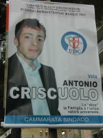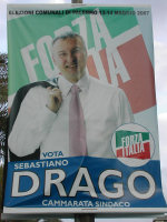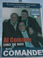 Mi fa piacere che il mio post abbia fatto sorridere. Anche se magari non ci crederà nessuno, l’idea di commentare i manifesti mi è venuta prima di venire a conoscenza del sito fascioemartello, prima di vedere il pezzo su repubblica e prima che questo stesso pezzo venisse ripreso dal sito dell’espresso… Tony lo sa. L’idea mi è venuta ricordando le elezioni nazionali in cui vinse Berlusconi. Ricordate? Sul web impazzavano parodie, commenti, fotomontaggi, che mi hanno divertita molto… tutto qui. Le foto/scansioni ai manifesti/santini/gonfaloni/ di Coppolino, Comandè, Criscuolo, Drago, Mineo, Piampiano, Portanova, Ribaudo, Terminelli e Tringali, le ho eseguite io. Il santino di Tringali, che reputo davvero il migliore, me l’ha fornito il mio fidanzato, che ringrazio a nome dei miei addominali (quando ho visto sto santino ho riso per delle ore). Per quel che riguarda gli altri, già lo sapete. Un bacio a Rino (…Rino, ailoviu…) volevo confessarti che, oltre ad amarti, faccio fantasie erotiche su di te: ricoprirti tutto di crauti e di birra tedesca, mentre ti picchio con un pretzel. Non stai in Cermania? Se non sei il rino che sta in cermania, allora apporterei delle varianti alle mie fantasie: arancine al burro e parmigiana. Che vuoi, l’amore fa fare i pensieri più strani.