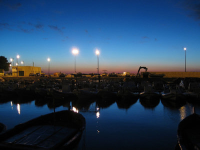 Foto qualunque, per non dire banale, cielo “bleu criard” insostenibile, dettagli invisibili -ombre disarmoniche, solo i locali sanno che si tratta di barchette- tranne la costruzione insignificante a sinistra, pure le luci da periferia perduta e lontana, seppure in armonia col nulla raffigurato, non contengono alcun interesse.