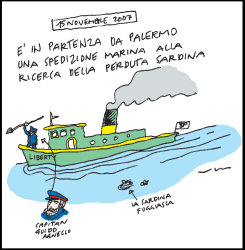 Se una sera vi chiamano e vi prospettano, “che fai dal 14 al 19 novembre?, ti va di partire su un rimorchiatore del ’48?, una pittrice e un regista hanno già detto di sì, non è che soffri il mal di mare?”, voi che rispondete? Ci devo pensare? Da piccola giocavo sempre ai pirati. Ho detto subito di sì, mi sono assicurata che la barca in questione, il rimorchiatore navetta Liberty Tug, fosse completamente restaurata, e ho domandato “non è che ci allontaniamo troppo?”. L’ idea del viaggio per mare è venuta a Guido Agnello, quello de La coppola storta e della fondazione Palazzo Intelligente, che s’è inventato un modo nuovo di promuovere il settore ittico siciliano (il progetto è finanziato dal Dipartimento Pesca dell’Assessorato Regionale della Cooperazione, del Commercio, dell’Artigianato e della Pesca), mettendo personaggi differenti fra loro per preparazione e competenze su un’imbarcazione che parte da Palermo e farà tappa in alcuni caratteristici porti siciliani dei borghi di Aspra, Porticello e dell’isola di Lipari. La trovata è piaciuta così tanto che su Il Foglio del 7 novembre Vincino ci ha dedicato una vignetta.