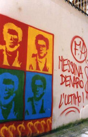 La solita idiozia dei giornalisti di studio aperto che a caccia di notizie, tentano di far passare per novità un murales che è li da tempo. Singolare il commento audio del servizio andato in onda su Italia 1 che esordiva piu o meno così: “stamane a Palermo è comparso un murales che ha dato un brivido raggelante ai palermitani appena svegli…”