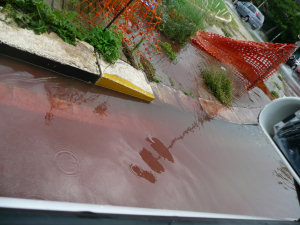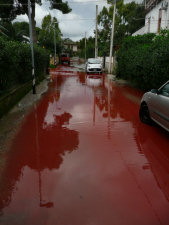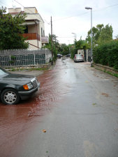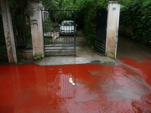 Rosso, ma è sempre liquame, ossia quella cosa che parte dai nostri scarichi (anche dei w.c.) e che invece di arrivare al depuratore viene disperso nelle strade attorno al ‘tombino’ della città candidata (forse) ad ospitare le olimpiadi (dei colibatteri).