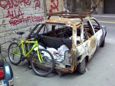 Quando si ha la certezza che nessuno rimuoverà quella carcassa che si sta riempiendo di sacchetti della spazzatura ad una angolo di corso Vittorio Emanuele, puoi attaccarci pure la tua bicicletta: il pericolo non è tanto quello che i Vigili la portino via, quanto, semmai, che qualcuno vi appicchi un nuovo falò…