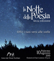 Si svolgerà stasera all’Oratorio di San Lorenzo (via dell’Immacolatella, 5) la terza edizione della manifestazione La notte della poesia organizzata dall’associazione Amici dei Musei Siciliani.