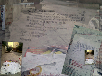 A Pallavicino ha fotografato una scena desolante: un libro di testo del liceo giaceva a terra spaginato, con tanto di nome del probabile proprietario in vista e pagine che citavano Kant e Rousseau. Ne ha fatto un collage.