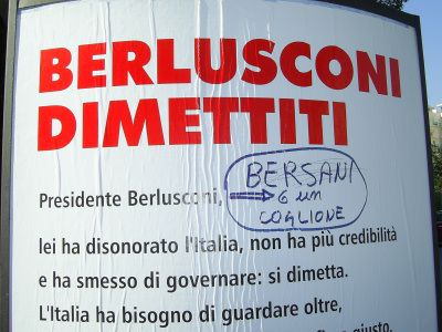 Scritta di popolo, scritta di Dio…Guardate un po’ cosa ha scritto un buontempone accanto al manifesto del Pd che invita Berlusconi a dimettersi?
