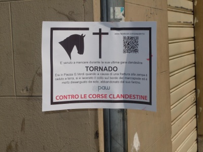 Il gruppo animalista Paw (abbreviazione di Palermo Animalista sul Web ma anche zampa in inglese) ha realizzato un’azione di guerrilla marketing realizzando finte chiazze di sangue con appesi i necrologi dei cavalli morti durante le corse clandestine (Varenne Jr., Cesare, Tornado, Fulmine) prima del corteo contro le gare clandestine di cavalli.
