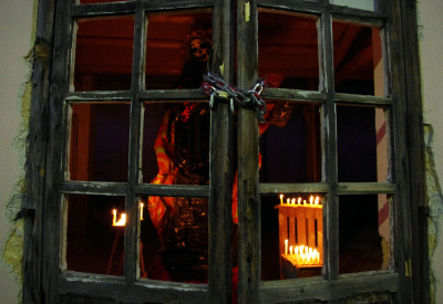 quello che più mi ha colpito di questo post è la quarta foto: una santuzza che si è messa lo scheletro in volto, rinchiusa dietro una finestra scostata e inchiavardata, circondata da ceri non si sà se per rischiarala di devozione o bruciarla, dimenticata per poter venir fuori una volta l’anno in una festa pagana che passa per religiosa, non tanto lontana da “santa muertos” dei narcos.