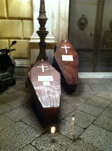 Al termine della manifestazione due finte bare sono state lasciate a ridosso di Palazzo delle Aquile.