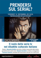 Alle 18:30 presso Mondadori Multicenter (via R. Settimo, 18) si svolgerà l’incontro Prendersi sul serial?. L’incontro organizzato da Ed è subito serial vuole approfondire il legame che intercorre tra serie tv e realtà. Relatori del dibattito saranno il giornalista Alessandro Buttitta, lo scrittore e sceneggiatore Giacomo Cacciatore e il presidente dell’associazione culturale Ed è subito serial Francesco Sciortino.