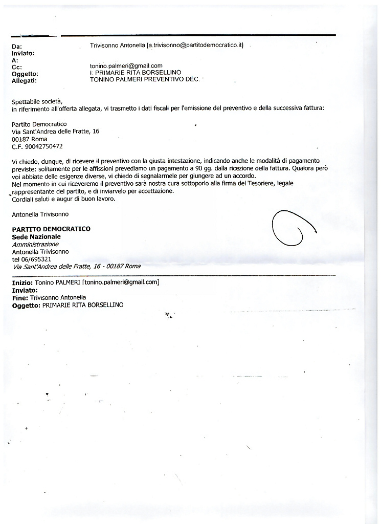 Davide Faraone è tornato sulla questione del presunto finanziamento del partito per le primarie a Rita Borsellino mostrando un’e-mail spedita dalla tesoreria nazionale del Partito Democratico con l’ordinativo di affissioni a favore di Rita Borsellino. Faraone ha parlato di finanziamenti per circa 40 mila euro e di un bonifico già eseguito per 14 mila euro a favore della società Space s.r.l. per spazi di affissione. Faraone ha dichiarato: «Chiedo le dimissioni del tesoriere nazionale Antonio Misiani, che è colui che ha fatto il versamento e che su questo ieri ha palesemente mentito, e chiedo a Bersani di intervenire immediatamente. […] Se il segretario del partito non interviene, significa che lui stesso è colui che ha autorizzato questa ingerenza che altera le regole delle primarie e rischia di distorcerne il risultato. […] La cosa grave e inaccettabile è che i soldi del finanziamento pubblico, soldi dei contribuenti, anche palermitani, siano usati a favore di un solo candidato, per giunta neppure iscritto al partito. Questa è una vera porcheria. Rita Borsellino, che stimo e ritengo persona corretta, non può più a questo punto raccontarci la storiella del “candidato della società civile”».