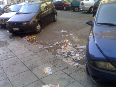 Comunque, aldilà di tutto, mi pare curioso che uno, che ha la fortuna di non avere cassonetti vicini e quindi la possibilità di respirare, butti la munnizza proprio sotto casa perchè ci siddia farsi la strada a piedi (o in macchina se è un chilometro, eh già, 1 km). Se non è incuria (per essere gentili) questa, io non lo so. È molto educativo per comprendere le vere ragioni del degrado, altro che fissarie