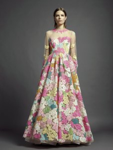 Esattezza e grazia caratterizzano le forme, ricche di echi couture. I fiocchi, i volant, le baschine, il pizzo, elementi cardine del linguaggio Valentino, sono ridotti a tratto, contraddistinti da cromatismi pop. Il pizzo è trattato come un tessuto, lavorato a intarsi multicolori, quasi dei camouflage, sugli abiti. Le materie sono preziose: razimir, mikado, georgette, pizzo bobinè. La palette dei colori è gioiosa e satura: giallo, verde mela, rosa bubblegum, rosso.