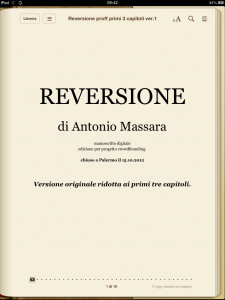 Reversione è un romanzo ancora in forma di manoscritto, e il suo autore ha deciso di proporre un progetto di crowdfounding, cioè chiedere ai suoi futuri lettori di sottoscrivere la pubblicazione in versione digitale, di farsene promotori, affinchè veda la luce. I sottoscrittori riceveranno subito il manoscritto e l’ebook dopo la pubblicazione, che avverrà solo se vi saranno abbastanza persone che credono che il romanzo lo meriti.