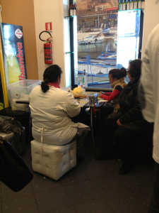 La suddetta pasticciona, invece, come si evince dalle foto, si trova in un luogo pubblico e per nulla al riparo da curiosi. Accanto a lei, poi, siedono persone con cappotto (indi provenienti da un ambiente esterno) che, immagino con mani poco pulite, toccano la pasta di zucchero in lavorazione. Non sarà stato un bel vedere.