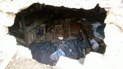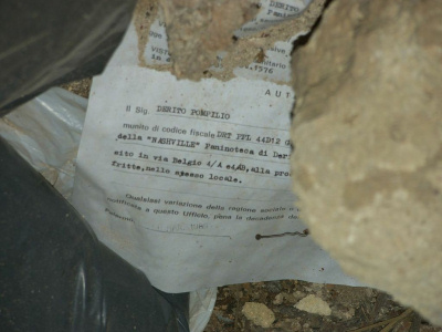 Nella consueta passeggiata in via Palatucci, ho scoperto che su una parete era stato aperto un pertugio che dava accesso a una sorta di stanzetta/archivio/bunker (nel senso che sono presenti vari fascicoli, alcuni risalenti anche a 40 anni fa, cosa che mi ha sorpreso parecchio, oltre a cuscini, resti di cibo ed altri materiali).