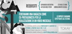 Mercoledì 9 e giovedì 10 ottobre a partire dalle 15:00 si svolgerà da Tokay Creative Studios il casting per la selezione di una ragazza che sarà la co-protagonista di un video musicale che verrà girato all’estero.