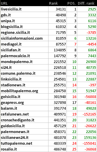 I dati sono puramente indicativi e interessanti soprattutto per confrontare più siti e valutarne i rapporti di forza basati sui numeri (posizioni in un ranking) messi a confronto (che non sempre rispecchiano il reale peso nella realtà cittadina).