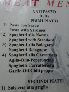 Passi buffet senza t, passi garlic senza c (e con la e), passi che in inglese si mette prima l’aggettivo e dopo il sostantivo, ma “spaghetti alla Norma” tradotta “spaghetti with standard” non ha eguali!!