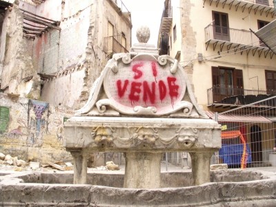 Chi ha imbrattato la fontana è uno stronzo, punibile nelle città civilizzate, se fosse stato intelligente avrebbe fatto un’installazione nello spazio della fontana, sullo stesso tema, ma senza danneggiare la fontana, magari “vendesi” dovrebbe mettersi su tutta la città degradata, fallita, sperando che qualcuno preso da pietà venga a salvarla, dato che noi facciamo solo danni, soprattutto al patrimonio che, vedi che combinazione, ci hanno lasciato ALTRI.