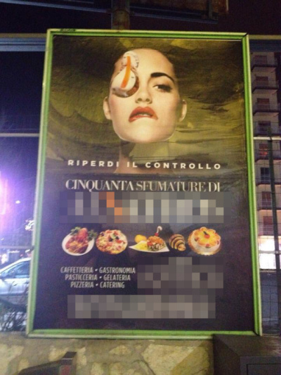 È appena uscito e già la pubblicità palermitana prova a sfruttarne la scia. Parlo di Cinquanta sfumature di grigio. Nella versione palermitana la testimonial ha un cannolo sull’occhio…