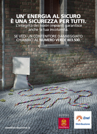 Il format utilizzato si avvale di un linguaggio semplice, diretto ed efficace, per comunicare ad un target ampio ed eterogeneo la pericolosità del contatto improprio con l’elettricità in caso di manomissione degli impianti di distribuzione dell’energia elettrica. Per la parte grafica, da una cassetta aperta si dipana un insieme di fili elettrici colorati che formano la sagoma di un individuo sull’asfalto cittadino. Il messaggio testuale, divulgativo e rassicurante, è focalizzato, invece, sulla tutela della sicurezza e sulla collaborazione con la cittadinanza, che viene invitata a contattare il mumero verde dell’azienda 803 500 per segnalare eventuali manomissioni e consentire un rapido intervento dei tecnici.