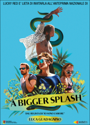 La leggenda del rock Marianne Lane è in vacanza sull’isola vulcanica di Pantelleria con il compagno Paul quando arriva inaspettatamente a interrompere la loro vacanza Harry, produttore discografico iconoclasta nonché suo ex, insieme alla figlia Penelope, provocando un’esplosione di nostalgia delirante dalla quale sarà impossibile mettersi al riparo. Fra risate, desiderio e rock’ n’roll, A Bigger Splash è un ritratto sensuale che deflagra in violenza sotto il sole del Mediterraneo.