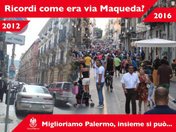 La seconda campagna riguarda via Maqueda e la pedonalizzazione. La prima immagine “ricorda” come era via Maqueda con il traffico veicolare e la seconda come è adesso con le fioriere, il passeggio dei pedoni e il contestuale risveglio commerciale di questo importante asse viario del centro storico.