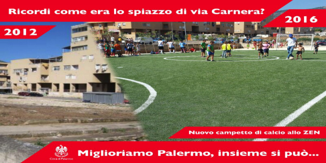 La nuova immagine riguarda il campetto di calcio inaugurato pochi giorni fa in via Carnera allo Zen, realizzato in un’area prima abbandonata.