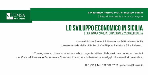 Oggi e domani presso la Lumsa di Palermo (via F. Parlatore, 65) si svolgono gli incontri del convegno Lo sviluppo economico in Sicilia: etica, innovazione, internazionalizzazione, legalità, una due giorni dedicata all’imprenditorialità siciliana e alla sua crescita come motore di benessere e di rinnovamento sociale.