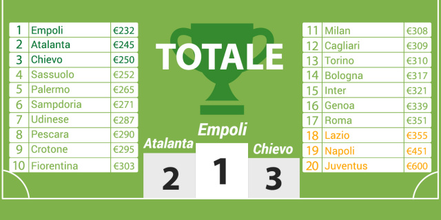 L’abbonamento annuale meno costoso è dell’Empoli, mentre bisogna spendere almeno 500 euro per vedere tutte le partite casalinghe della Juventus. Anche i tifosi partenopei devono spendere almeno 350 euro per vedere i propri beniamini. I tifosi della Juventus e del Napoli devono spendere quasi 90 euro per avere la maglia della propria squadra del cuore, mentre i tifosi dell’Udinese possono averla per quasi alla metà. Considerando abbonamento, maglia e sciarpa, la squadra che meno costa ai propri tifosi è l’Empoli mentre chi deve spendere di più sono gli juventini.