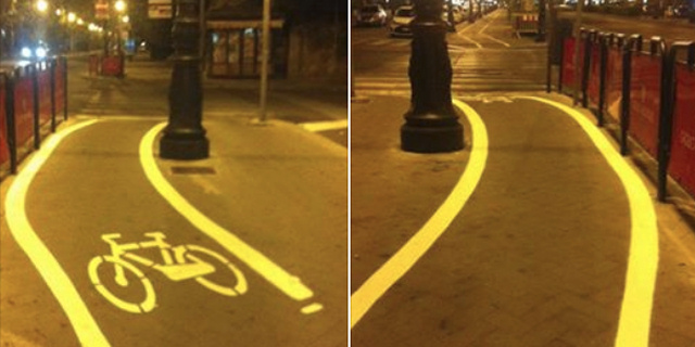 Ora i disegnetti col gessetto fatti a terra, che non delineano una pista ciclabile perché pare abbia bisogno anche di una segnaletica verticale ed una orizzontale, dovrebbero costituire la cosidetta pista ciclabile bene ora vorrei farvi provare l ebrezza di percorrere le cosiddette piste ciclabili e tornare a casa contenti e sereni, facendo non solo la gincana sulla pista ma anche tra i pedoni ignavi che la percorrono!