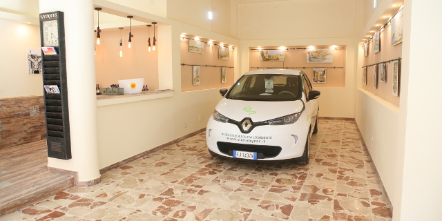 L’ufficio rent-a-car è dedicato alla mobilità green e al noleggio di automobili elettriche e ha un angolo salotto dove degustare vini locali o curiosare nella piccola libreria messa a disposizione dei visitatori, una mini galleria d’arte dove trovano esposizione le riproduzioni degli acquarelli dell’artista francese Fabrice Moireau e una sala adibita a manifestazioni ed incontri culturali e musicali.