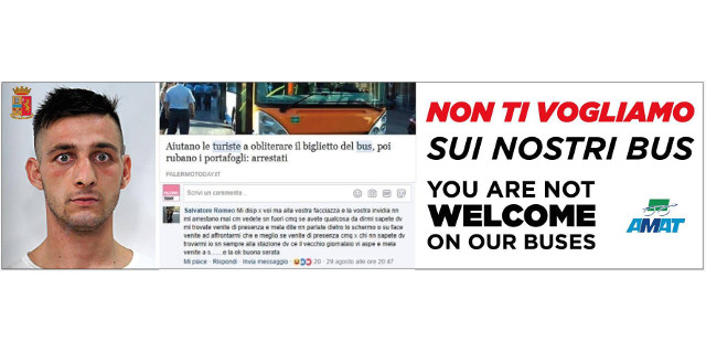 L’Amat ha fatto affiggere sugli autobus delle linee 101 e 102 la foto segnaletica di un borseggiatore seriale arrestato dalla Polizia lo scorso 29 agosto che dopo la scarcerazione si era vantato su facebook di essere già libero e aveva scritto dei messaggi minacciosi verso chi lo aveva criticato. La foto è accompagnata dal commento lasciato sulla pagina facebook del giornale online Palermo Today e dalla scritta bilingue «Non ti vogliamo sui nostri bus».