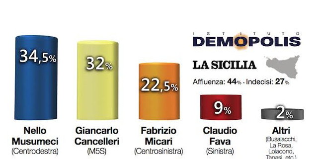 Sondaggio Demopolis sulle regionali: Musumeci in testa, astensionismo sale