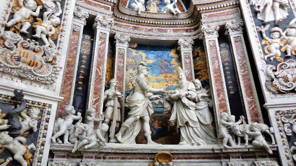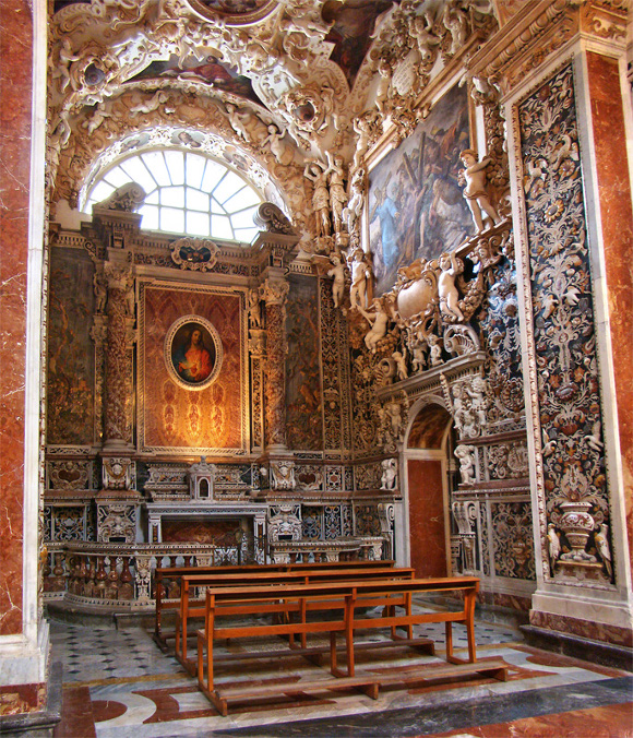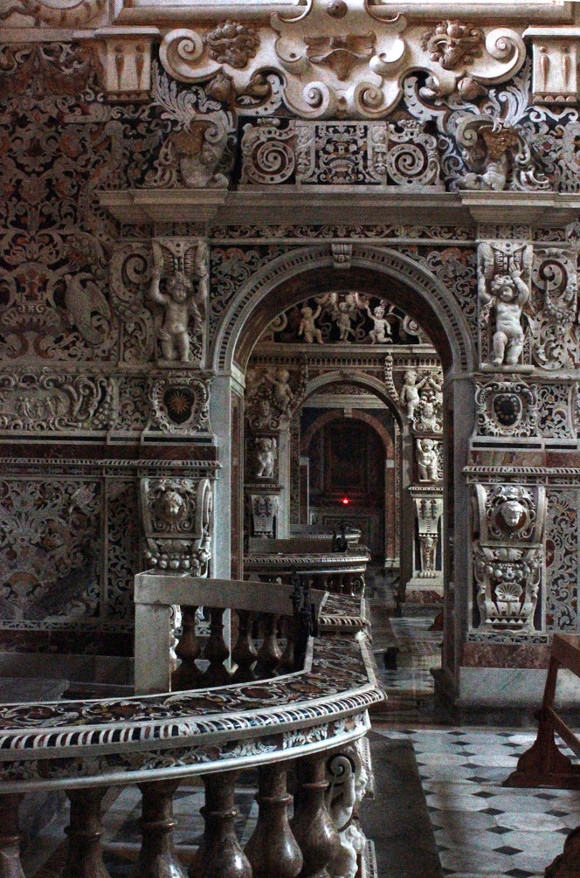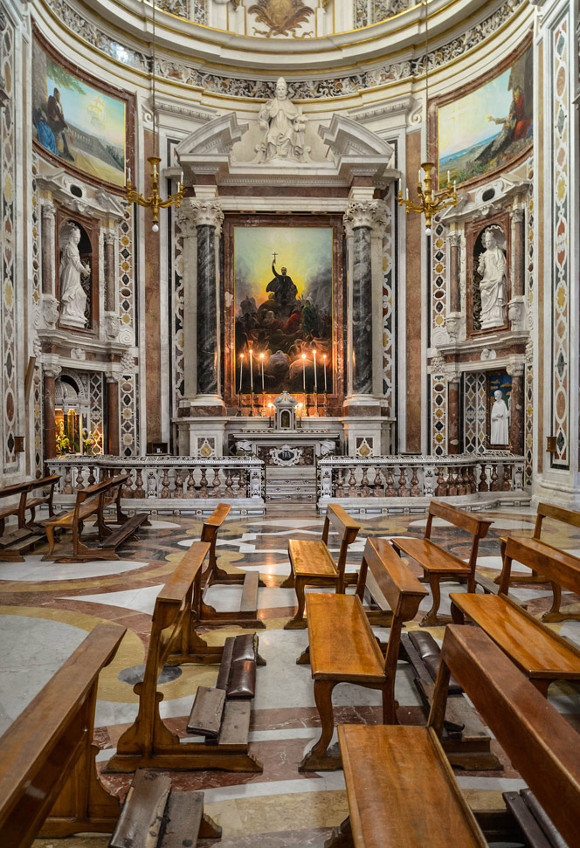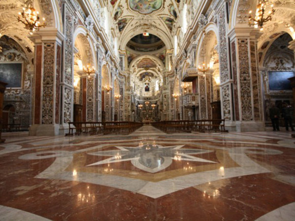 Entriamo. Impressionante la bellezza delle tre navate, del presbiterio, delle cappelle laterali. La vertigine delle raffinate architetture si fonde con quella delle sculture e delle pitture. C’immergiamo nelle opulenti decorazioni marmoree (dette ‘a mischio’, cioè a intarsi nel marmo, con motivi floreali e figurativi), con stucchi e sculture gaginiane, affreschi e tele. Le pareti sono completamente coperte da marmi, tarsie, statue e arabeschi senza fine. Nella tribuna dell’abside colpiscono i bassorilievi in marmo raffiguranti l’Adorazione dei Pastori, l’adorazione dei Magi, i gruppi marmorei di Abigail e David, e quello di Achimelech e David (questi ultimi ad opera di Vitagliano su disegni di Giacomo Serpotta). Di ammirevole pregio anche l’organo a 4000 canne.