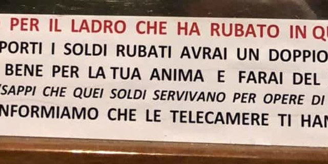Il testo: «Se riporti i soldi rubati avrai un doppio beneficio. Sarà un bene per la tua anima e farai del bene ad altri. Sappi che quei soldi servivano per opere di carità. Ti informiamo che le telecamere ti hanno visto bene!».