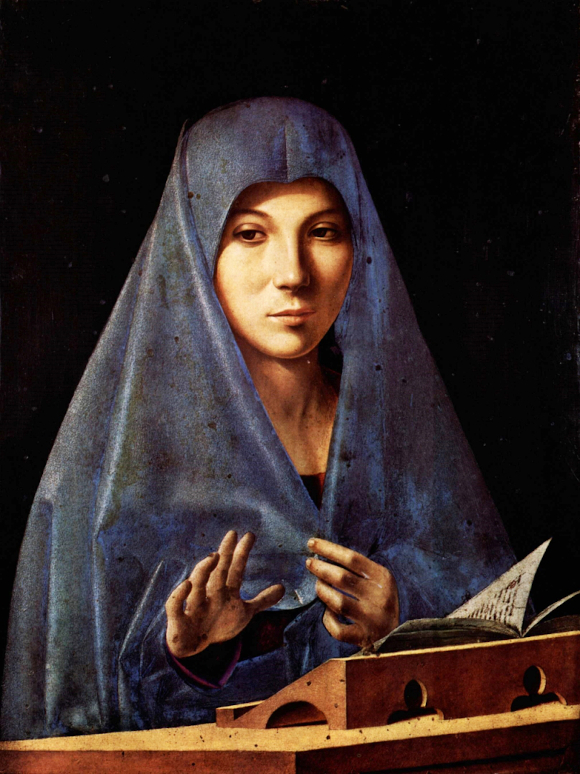 Maria sta guardando il pittore mentre la dipinge, forse perché lo sguardo di questa donna vuole rappresentare anche l’interiorità dell’uomo, come l’interiorità di tutti noi. In realtà Maria sporge la mano per tenere lontano sia noi, sia il pittore, sia l’angelo, come quando noi diciamo a qualcuno “basta” con un gesto. Non le serve che qualcuno le annunci qualcosa, perché già sa tutto nella sua coscienza. Secondo Sgarbi, quella mano vuole dire “taci”. Da un punto di vista tecnico, è funzionale quindi questa profondità della mano, che si contrappone all’altra, la quale invece serve a mostrare la purezza della Vergine. Ella è, infatti, in posizione di protezione: Maria si chiude il velo e viene mostrata in questo in modo molto umano: una donna pudica, che si protegge, che è riservata.