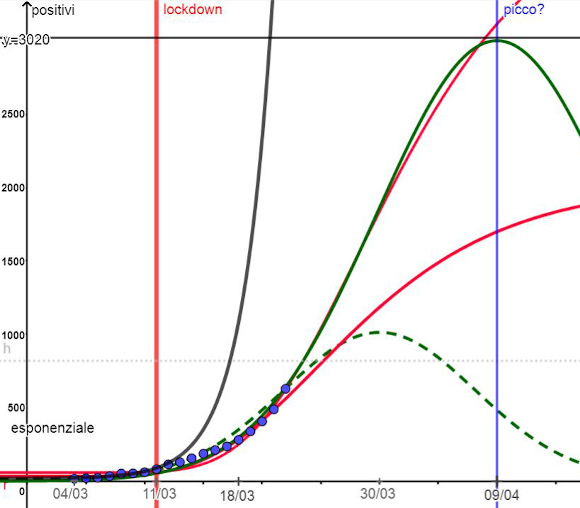 Ricorderete che ipotizzavamo un picco di 800 contagi al 30 marzo ma i punti, dopo aver seguito per alcuni giorni una curva gaussiana compatibile si sono sganciati (l’ipotesi/certezza è, purtroppo, che siano contagi arrivati con i treni dal nord dopo il “lockdown” dell’11) e sembrano compatibili (soprattutto con il 630 di oggi) con una nuova gaussiana (in verde). Considerato il fatto che il picco nazionale non è stato il 18 marzo e potrebbe spostarsi in avanti di due settimane (lo ha affermato Angelo Borrelli due giorni fa) abbiamo provato a immaginare il picco siculo (siamo in ritardo di qualche giorno sul nord Italia) il 9 aprile. Purtroppo se così fosse potremmo attestarci a poco più di tremila contagi.