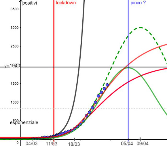 Le curve calcolate con la funzione Gompertz (in rosso) confermano che andremo oltre i duemila contagi ma potremmo non superare 2700.