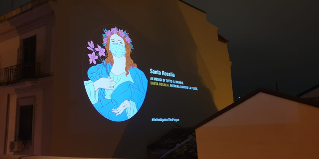 Il collettivo di artisti e operatori della cultura ExVoto ha realizzato una rappresentazione di Santa Rosalia, che liberò Palermo dalla Peste, con la mascherina che richiama i dispositivi di protezione individuale utilizzati contro il Coronavirus.