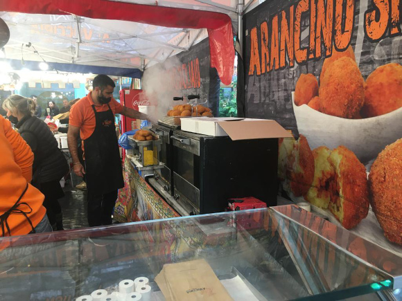 Piacevole sorpresa domenica 24 a Firenze presso il complesso “The Space”, dove è stato allestito un coloratissimo villaggio gastronomico, chiamato A’ Vucciria old Sicily & new food con tutte le nostre leccornie. Frutti di Martorana, biscotti tipici, pane ca’ meusa, polpo bollito, u’ castagnaru, fritture di tutti i tipi, dolciumi, cannoli, cassate, cassatine e tanto altro, tutto in nome della migliore tradizione palermitana in un’orgia di goduria gastronomica. Splendide le arancine in tutte le loro varietà; unica “pecca”, grave per l’orgoglio panormita, la scritta “arancino” invece che “arancina” sui cartellini dei prodotti e su qualche stendardo. Ospite del giorno il bravissimo Sperandeo, circondato da fans, cui ho fatto notare il bug e che prontamente mi ha detto di riferirlo all’organizzatore…