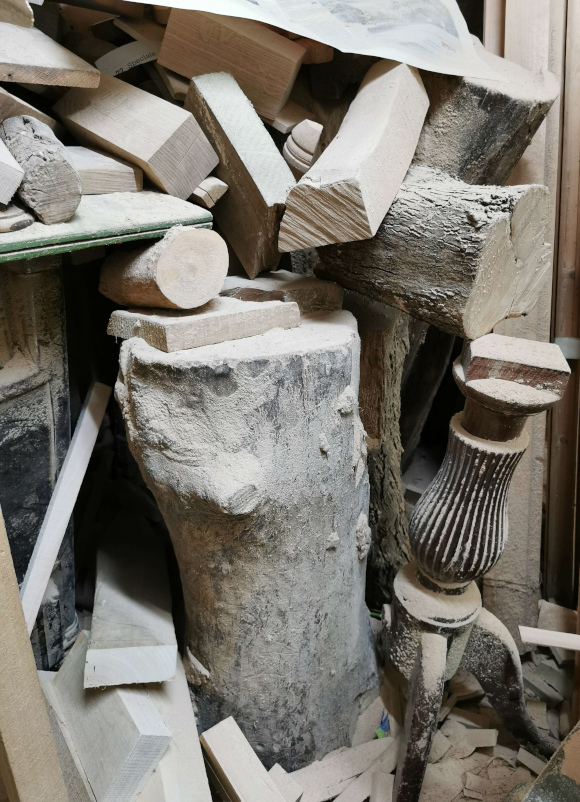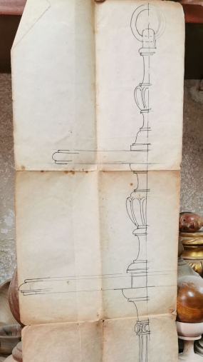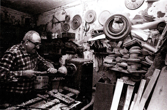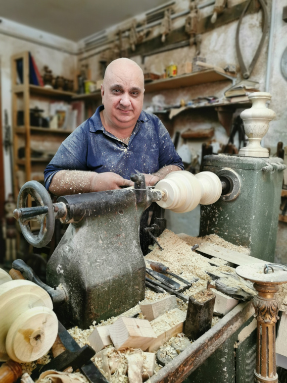 Entrare nel suo laboratorio per la lavorazione al tornio è come visitare un museo ancora vivo e colmo di oggetti vissuti, pieno di pezzi di legno semilavorati, modelli, attrezzi antichi, un tornio grande, un tornio piccolo, una grande sega a nastro, madreviti per filettature, compassi in legno, in metallo, pialle a mano, balestre di macchina per incidere e modellare, misteriosi ferri di varia natura, morsetti, seghe di diverse misure, che ci riportano al passato ed al fascino del decoro e della ricchezza estetica degli oggetti.