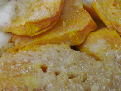Priviamo la nostra zucca della scorza. Tagliamola a fettone e poi a fettine spesse circa 5 mm. Poniamole in una teglia già unta con olio d’oliva (poco) con un minimo di sovrapposizione tra una fetta e l’altra. Diamo una spruzzatina di olio e una spolverata di sale, e di pangrattato. Inforniamo in forno preriscaldato a temperatura medio-alta, per circa 15 minuti.