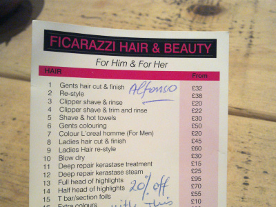 Giovedi’ scorso, a Charing Cross, mi hanno dato questo volantino, per una parruccheria in zona. Ci sono rimasta! Non credo che andro’ mai a conoscere il sig Alfonso, che magari non e’ nemmeno siciliano, ma mi fa piacere sapere che si sia gia’ adeguato alle tariffe londinesi.