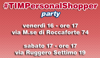 vi aspettiamo oggi e domani con l’appuntamento #TIMPersonalShopper party: questo pomeriggio dalle 17 nel Negozio TIM di via Marchese di Roccaforte 74 a Palermo e domani nel Negozio TIM di via Ruggero Settimo 19.